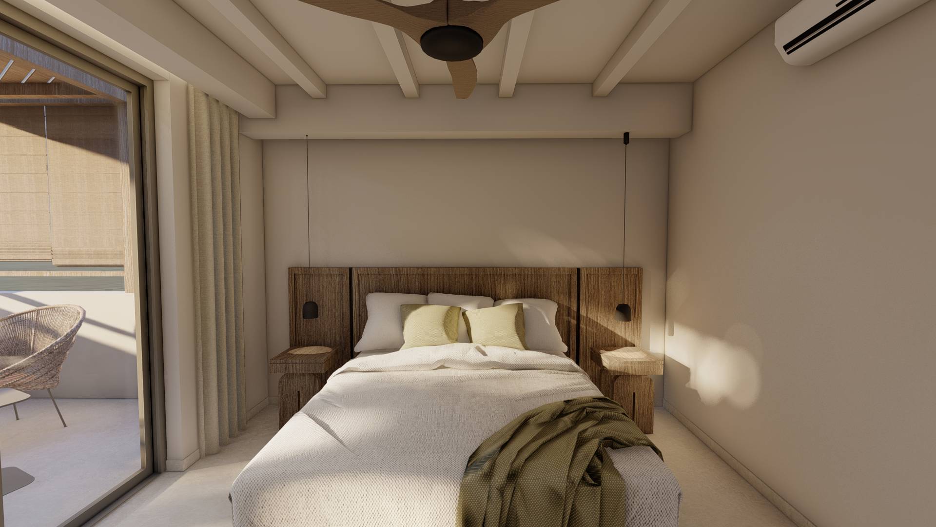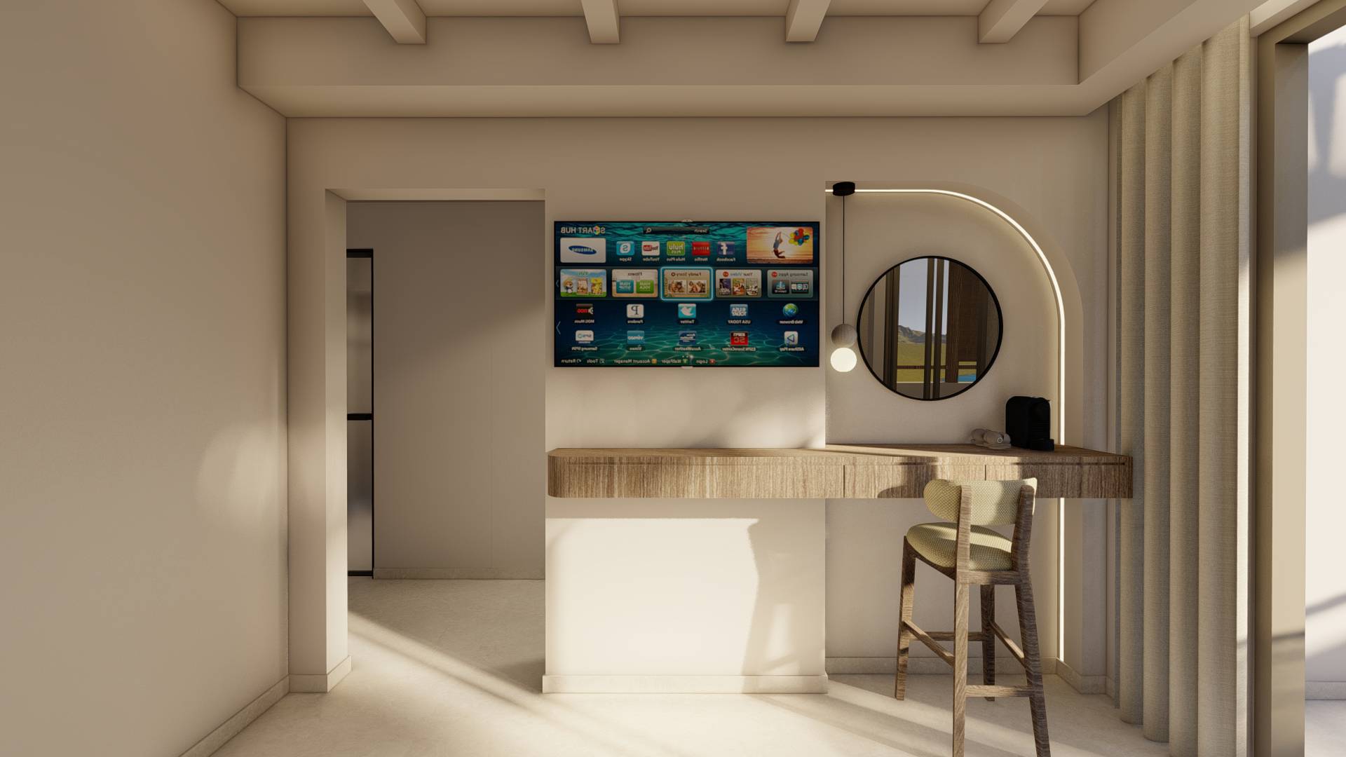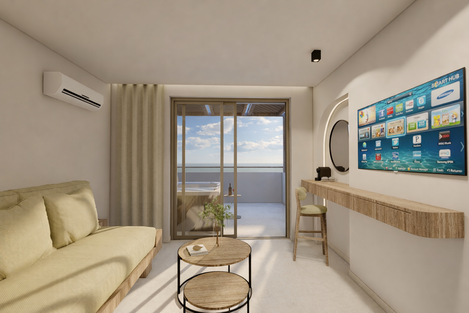 Designed for an elevated stay, the Junior Suite Sea View with Hot Tub combines modern comfort with breathtaking sea views. It features a refined bedroom, a cozy sitting area, a bathroom with shower, and a private balcony with an outdoor hot tub. Perfect for couples or special occasions, the suite promises memorable moments of relaxation under the Cretan sky.